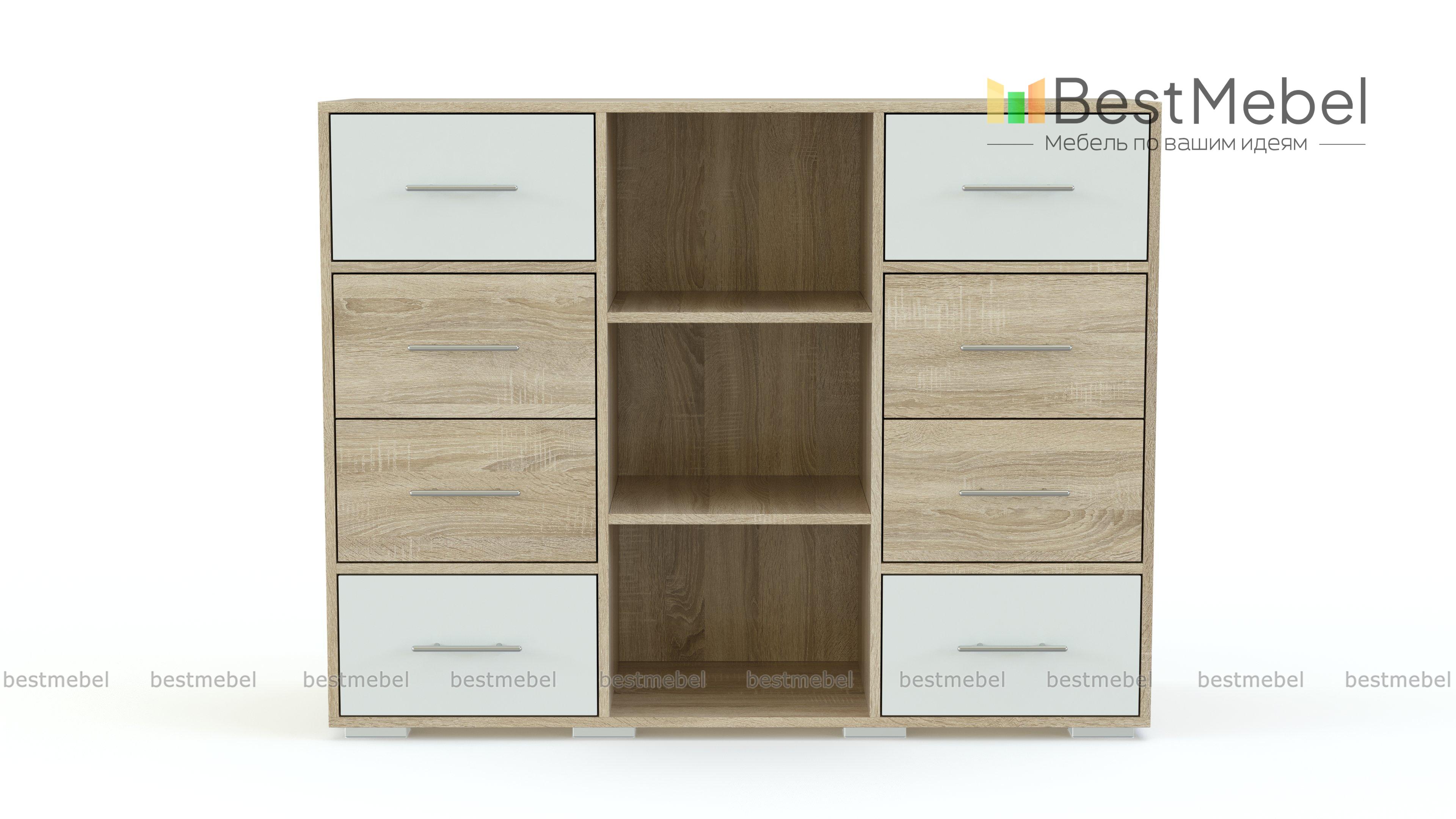 Яркая модель Бемби К-8 BMS станет отличным дополнением детской комнаты. Средние габариты позволят вписать комод и в просторные, и в небольшие помещения, а наиболее подходящую расцветку вы всегда сможете подобрать в нашем интернет-магазине. Комод оборудован секцией из открытых полок по центру и боковыми отделениями с выдвижными вместительными ящиками контрастных оттенков. Фасады дополняют эргономичные ручки-рейлинги, экологичные материалы безопасны и просты в уходе.