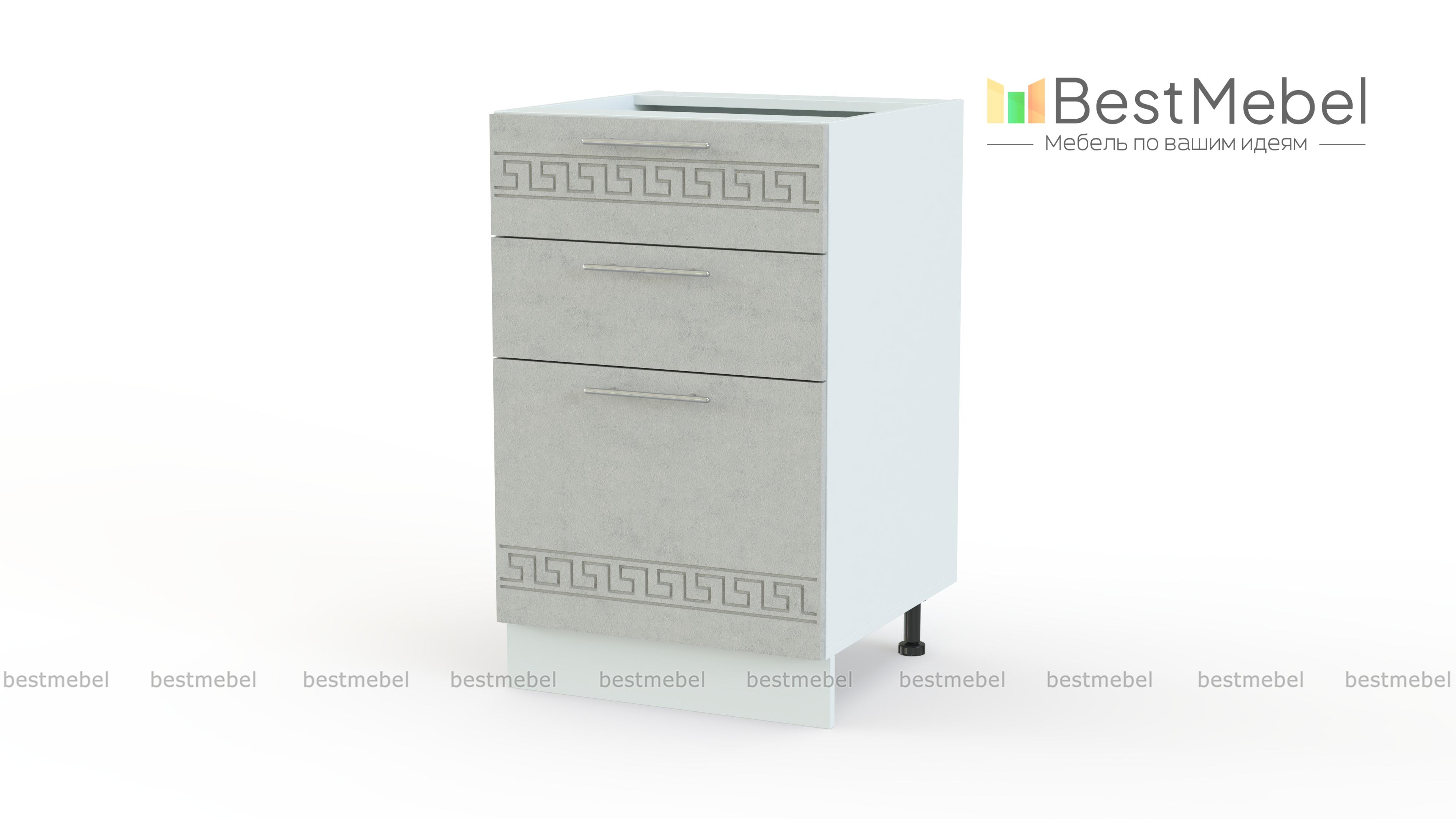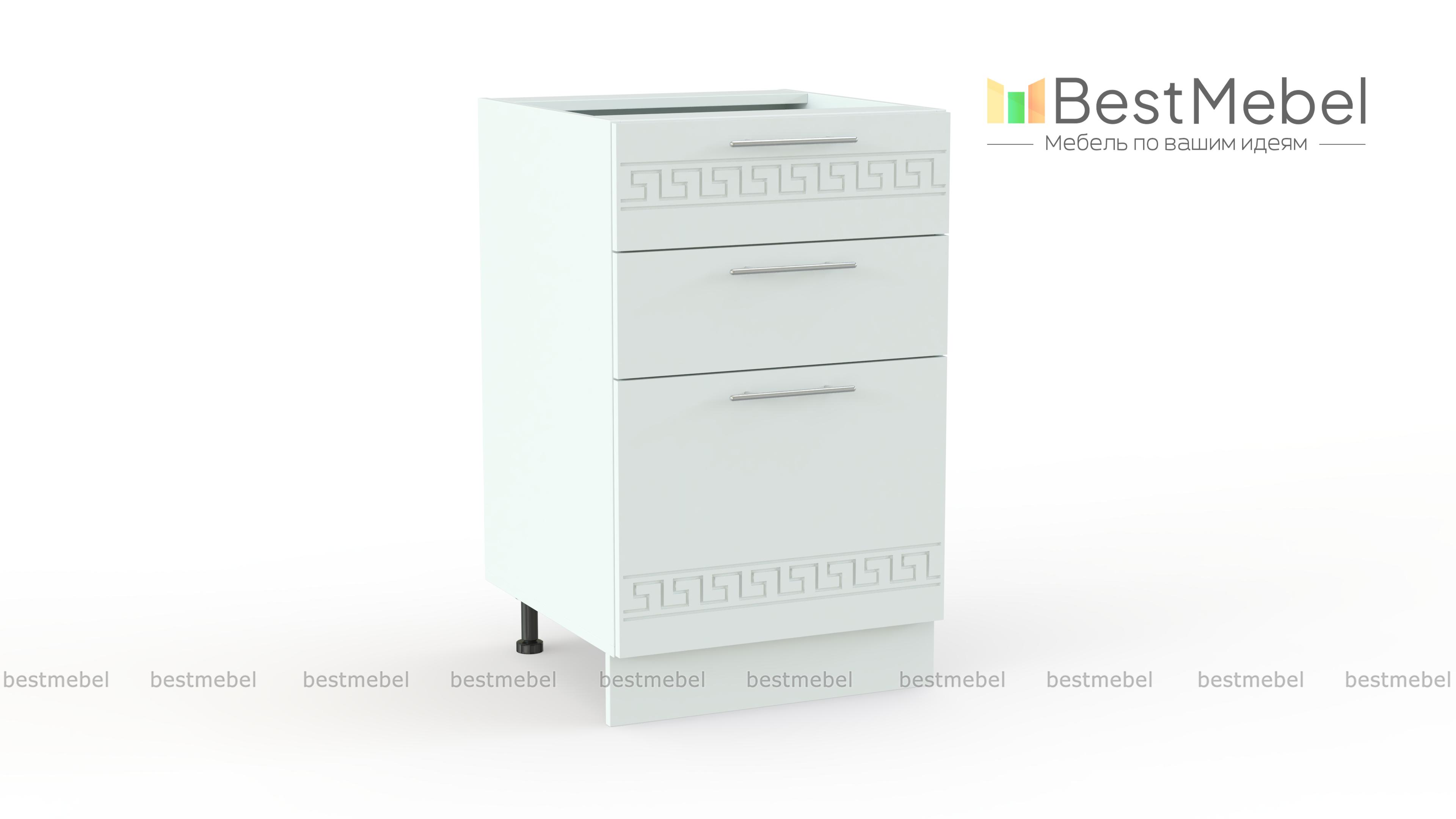 Тумба напольная 3 ящика Греция BMS поможет оборудовать кухню системой хранения, удобной для мелочей. Под широкой столешницей располагаются три выдвижных ящика – два малых и один большой, которые позволят систематизировать кухонные принадлежности. Изящные и визуально легкие, матовые фасады с декоративным орнаментом износостойки и просты в уходе. Регулируемые пластиковые опоры обеспечат устойчивость. Купить тумбу напольную 3 ящика Греция BMS вы сможете по доступной цене в нашем интернет-магазине.