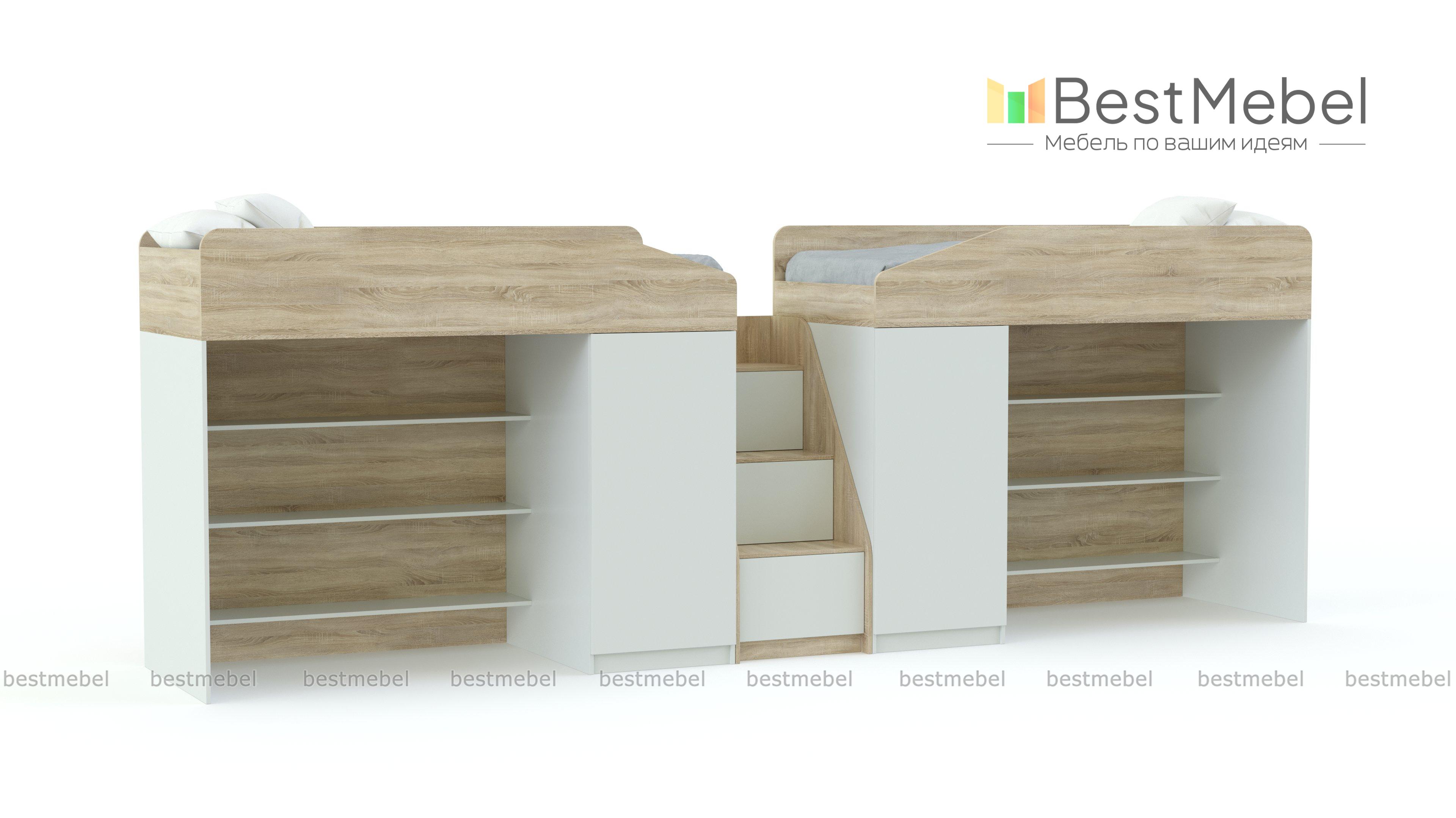 Двухъярусная кровать Миф 11.8 BMS – многофункциональный комплект, который оборудован не только комфортными спальными местами с высокими бортиками для двоих детей, но и индивидуальными игровыми зонами с вместительными стеллажами. Предметы гардероба смогут разместиться во встроенных распашных шкафчиках, а для игрушек или постельного белья предназначены ящики под ступеньками устойчивой лестницы. Купить двухъярусную кровать Миф 11.8 BMS вы сможете по лучшей цене в нашем интернет-магазине.