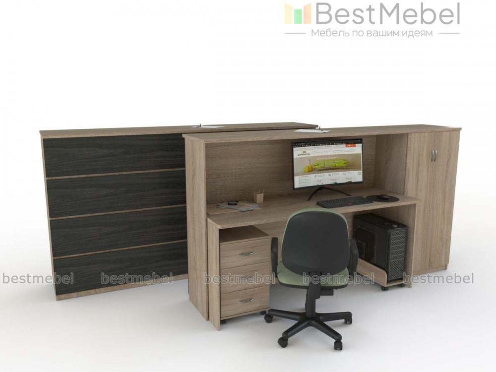 Ресепшен Верта № 6д BMS включает в себя все необходимое администратору для комфортной работы. С внешней стороны стойки располагается удобная для посетителей столешница, а с внутренней – компьютерный просторный стол с выкатной секцией под системный блок, мобильная тумба и распашной шкафчик с полками. Выполненная в древесных тонах, модель декорирована широкими фасадными планками контрастного цвета. Купить ресепшен Верта № 6д BMS вы сможете в нашем интернет-магазине по доступной цене.