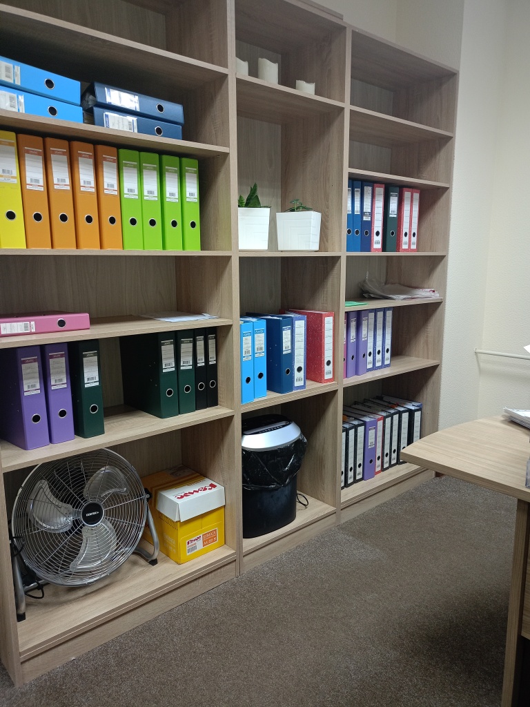 Заказали стеллаж в бухгалтерию. Немного не рассчитали расстояние между полок. Сборщик добавил отверстий, и получилось неплохо. Фото прикладываю. Цвет практически совпал с основной мебелью.