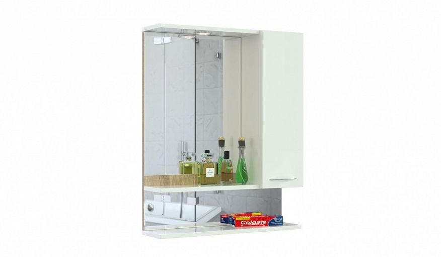 Шкаф зеркальный в ванную Ромира 1 BMS отличается минималистичным дизайном, а контрастные оттенки с имитацией текстуры дерева придают интерьеру уютный вид. Подвесная прямоугольная модель оборудована узким распашным шкафчиком для хранения уходовых средств и двумя широкими открытыми полками в нижней части. Особенно комфортным сделает пользование встроенная в козырек подсветка. Купить шкаф зеркальный в ванную Ромира 1 BMS вы сможете по выгодной цене в нашем интернет-магазине.