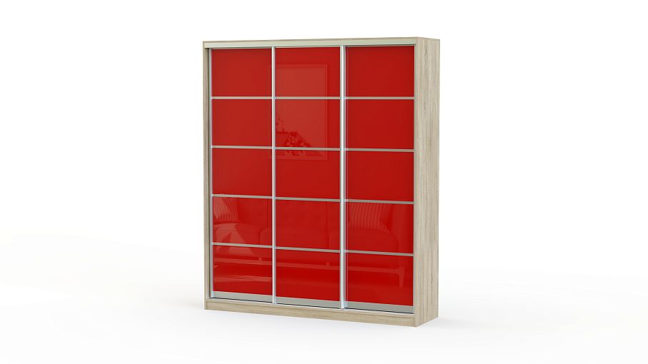 Шкаф-купе Гранат BMS имеет три раздвижные двери, декорированные цветным стеклом гранатового оттенка. Прочный алюминиевый профиль делит каждую створку на пять равных прямоугольных сегмента, создавая простые геометрические формы. Такой дизайн шкафа отлично впишется в любой интерьер, придавая ему оригинальности. Внутреннее наполнение по умолчанию сочетает в себе вместительные полки и отсек для хранения одежды на штанге при помощи вешалок.