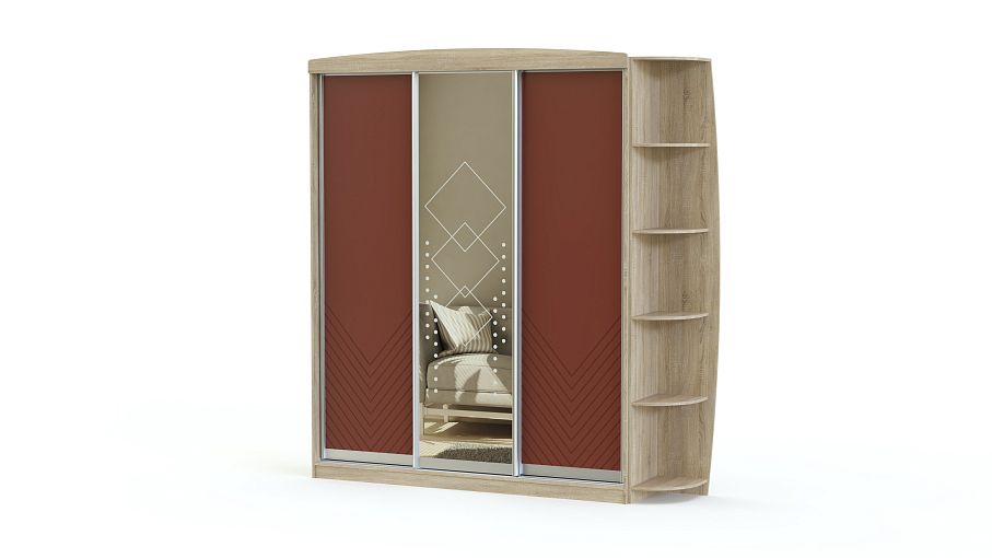 Шкаф-купе Куб BMS с тремя створками и дополнительным открытым стеллажом с полками отлично впишется в просторную прихожую или небольшую квартиру-студию. Комбинированное оформление фасада шкафа позволяет гармонично вписать его в интерьер помещения, не утяжеляя его. Центральная створка по умолчанию декорируется цельным зеркалом с пескоструйным рисунком. Внутреннее наполнение шкафа может быть подобрано в индивидуальном порядке и включать выдвижные ящики, штанги для вешалок и полки.