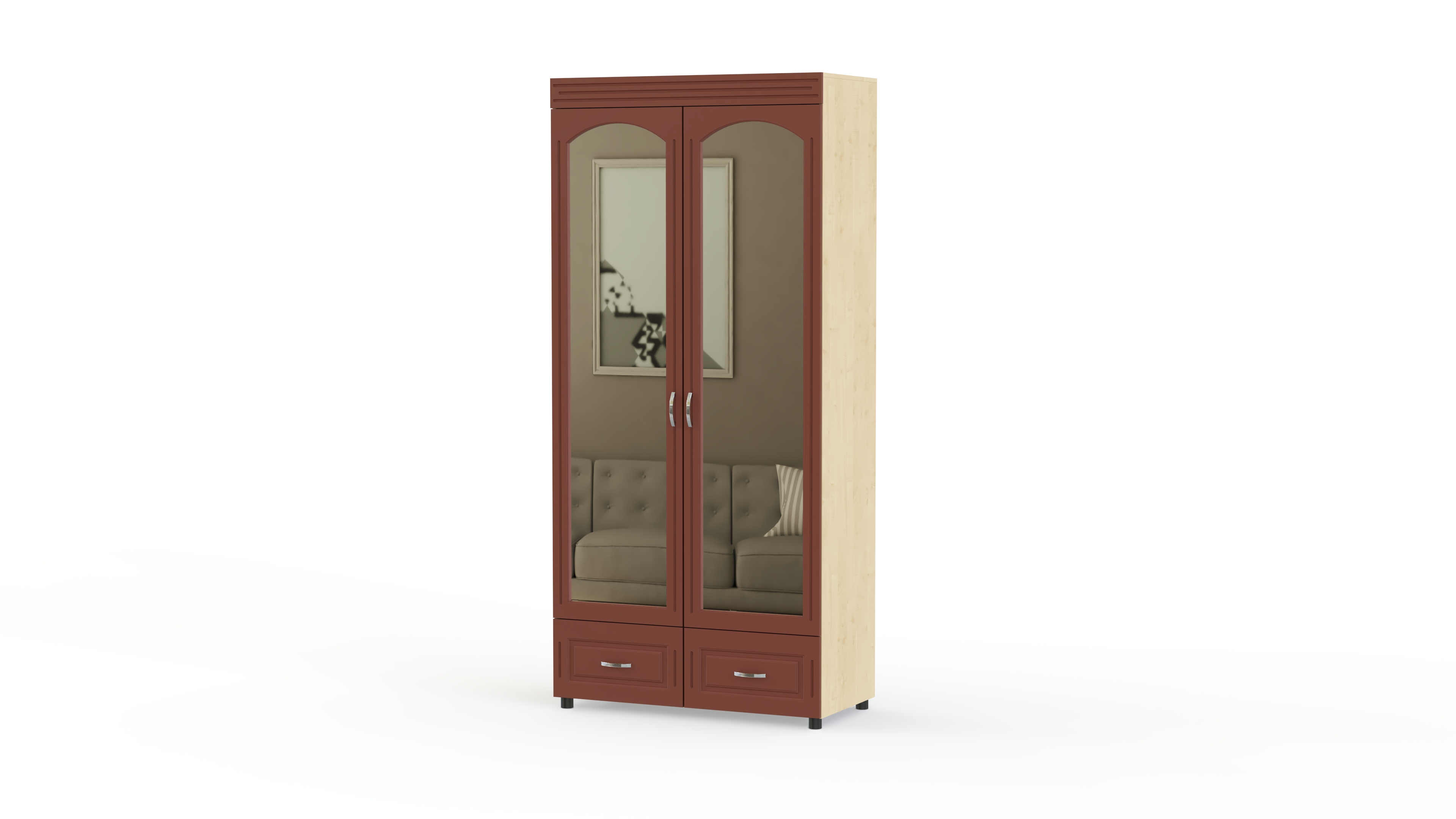 Элегантный классический комплект для спальни Элизабет Композиция 3 BMS, выполненный в светлых тонах, выглядит особенно легко и атмосферно и станет в интерьере вашего дома стильным акцентом. В гарнитур входят платяной шкаф с изящными полукруглыми зеркалами, туалетный столик с навесным широким зеркалом, удобная двуспальная кровать и две прикроватные тумбы. Фасады мебели декорированы металлическими, под позолоту, оригинальными ручками, придающими всему комплекту винтажный оттенок.