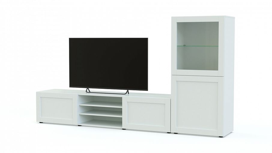 Стенка Бесто Besta 4 занимает минимум места и легко вписывается в пространство маленькой гостиной. Широкая ТВ-тумба с двумя открытыми полками для хранения сопутствующих аксессуаров и выдвижными ящиками по бокам дополнена комбинированной витриной. С традиционными рамочными фасадами нейтрального цвета стенка выглядит просто и элегантно, визуально облегчая интерьер. Купить стенку Бесто Besta 4 с возможностью выбора цвета приглашаем в наш интернет-магазин. Выбирайте мебель в стиле IKEA (ИКЕА) от производителя BestMebelShop!