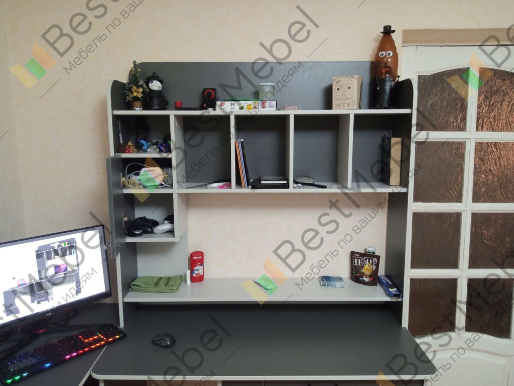 Лучший стол, который нашел для себя на сайте. При заказе попросил его видоизменить под себя. Кромка 0,4 добавил, цвет дуб молочный, цвет кромки Орех Гварнери. Ширину основного стола увеличил до 1100мм, ширину доп стола уменьшил до 300мм. Верхотуру сделал шириной в оба стола. Ящик на верхотуре поднял вровень с остальными полками. Выдвижной ящик под столом убрал, добавил туда выдвигающую полку для клавиатуры. Плюс ответстия для проводов. Сборщик собрал за час. Получился отличный стол, идеально под себя.