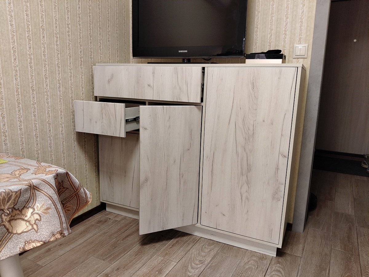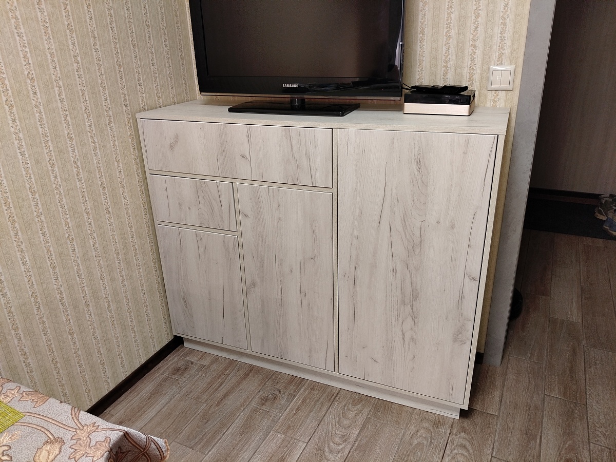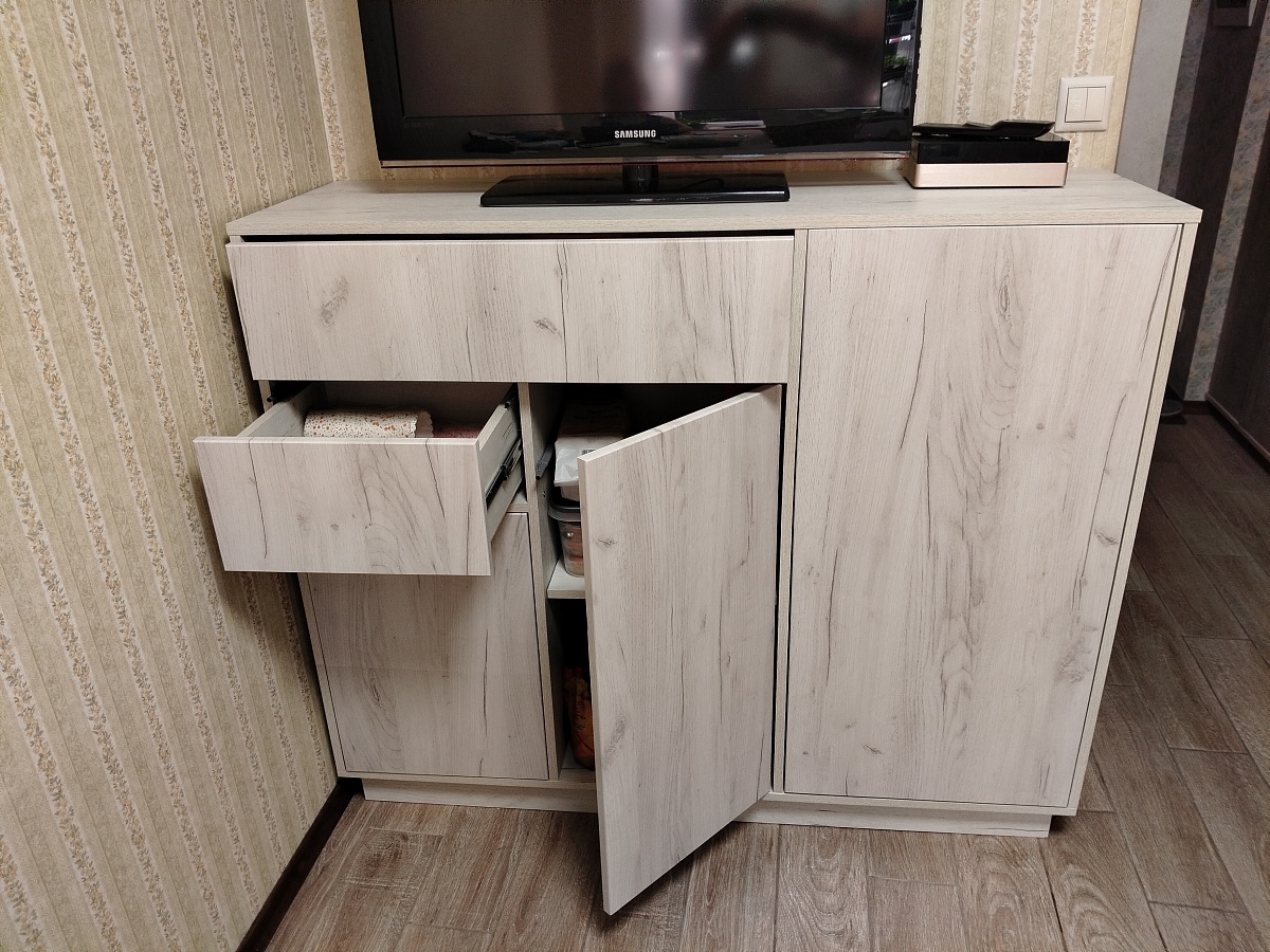 Тумбу заказали в своих размерах и цвете дуб крафт белый. В целом, мы ей очень довольны. Быстрое изготовление, отсутствие царапин и сколов, тактильно приятный материал. В процессе сборки возник вопрос. Почему "задняя стенка ДВП в паз" состоит из 3 частей? Ожидали ее цельной или хотя бы из 2х частей, чтобы верх и низ фиксировался в пазах. И, конечно, хотелось бы более подробную инструкцию по сборке.  Для тех, кому может понадобится, прилагаю размеры упора-защелки с толкателем, чтобы правильно выставить его на дверцах и ящике.