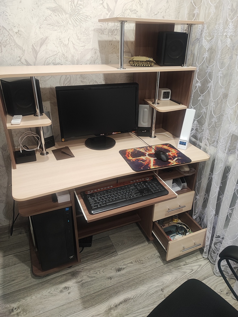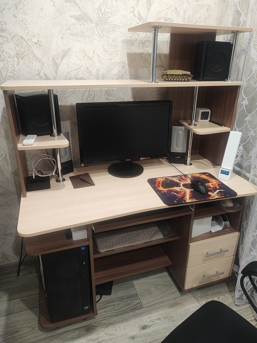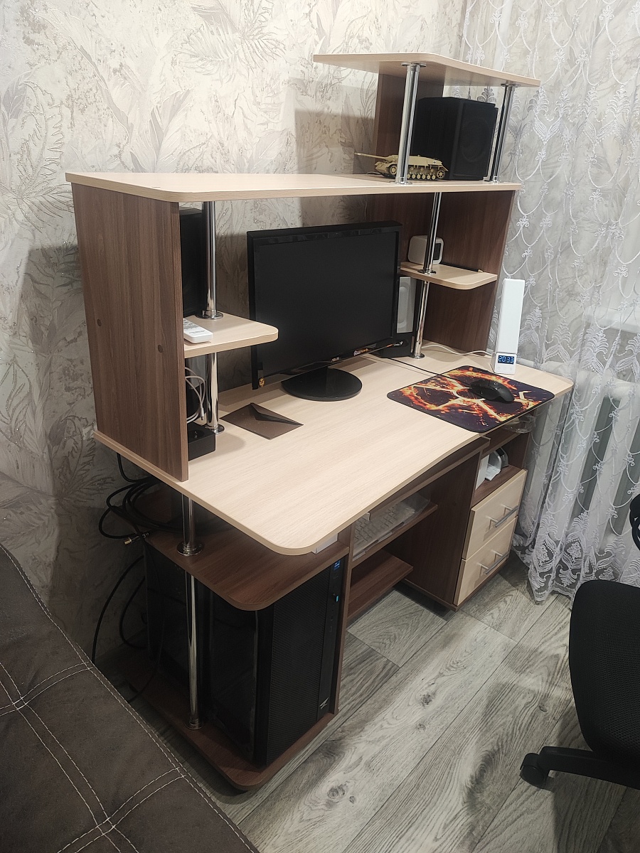 Приобрел данный стол пару месяцев назад. Стол очень понравился. Только полочку вторую снизу можно было бы сделать поуже, чтобы колени не упирались. Так же понравилось что на сайте можно самому конструировать и подбирать что тебе надо. А потом ещё и в 3d посмотреть. Номер заказа 00000919488.