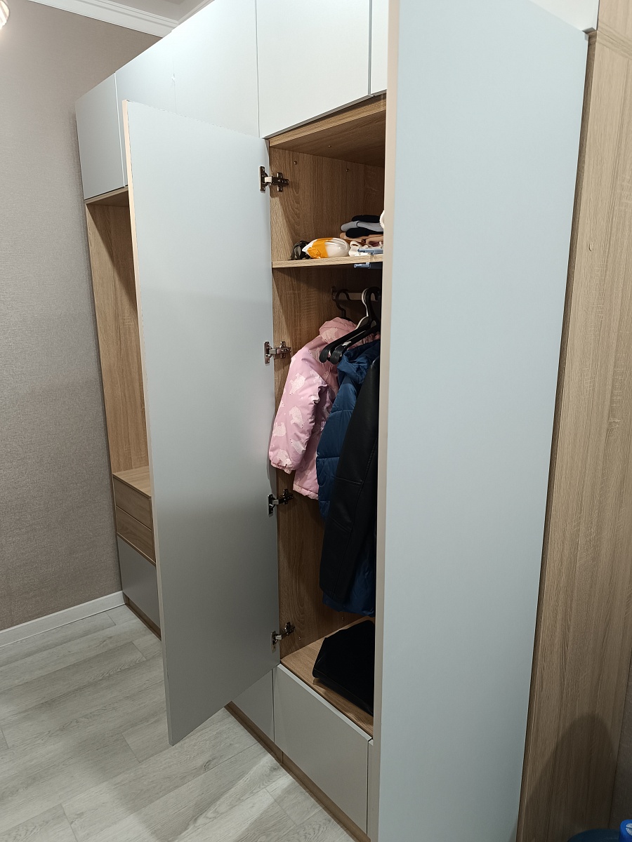 Внешний вид оцените сами, сама возможность подобрать размеры под себя - круто. Качество изделия оцениваю как такое себе. Водитель привез всё целое, не возражал, если будет проверка. В то же время ссылался на некий договор, в котором написано, что не принять товар нельзя, можно лишь обращаться потом долго и нудно, чтобы кто-то что-то чего-то там. По факту никакого договора никто не подписывал.Но нам повезло, повреждений не было. Инструкция к товару настолько ничтожна, что можно считать ее оскорбительной по отношению к покупателю. В электронном виде по QR-коду конечно же ничего нет. Тем, кто будет покупать этот шкаф, дам совет: не снимайте сразу наклейки со стенок, они подписаны, по ним и будет сборка. Иначе замучаетесь подбирать что и куда соединять. Прикладываю фото наклейки.Почему только пять фотографий можно приложить?!