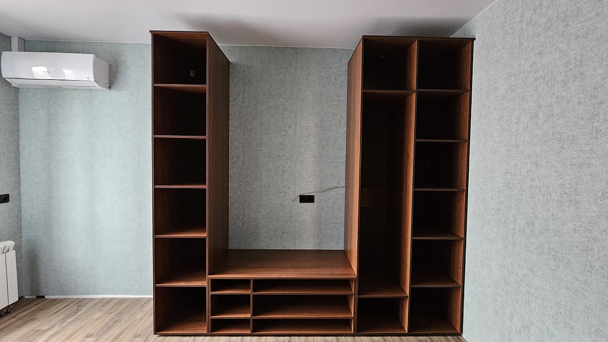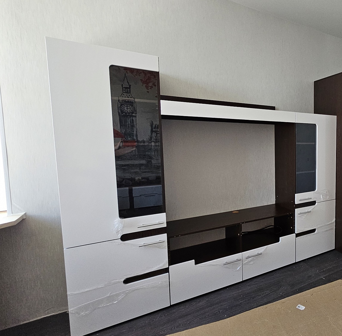 Стенка смотрится очень современно, идеально сочетается с кроватью и тумбами из этой же серии. Хотелось бы повыше шкафы и открывающуюся дверку под тв-тумбой, иначе пропадает место.
