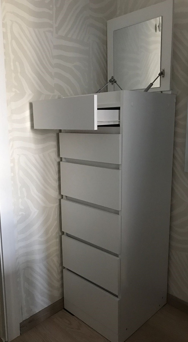 Заказ 00000788555. Отличный комод, оптимальное соотношение «цена-качество», привлекательный минималистичный дизайн. Занимает мало места, но при этом вместительный. Доставили вовремя. Единственный недостаток-непонятная инструкция по сборке. Самостоятельно собирать не решились, заказали сборку, хотя точно такой же комод из Икеа легко собрали сами.