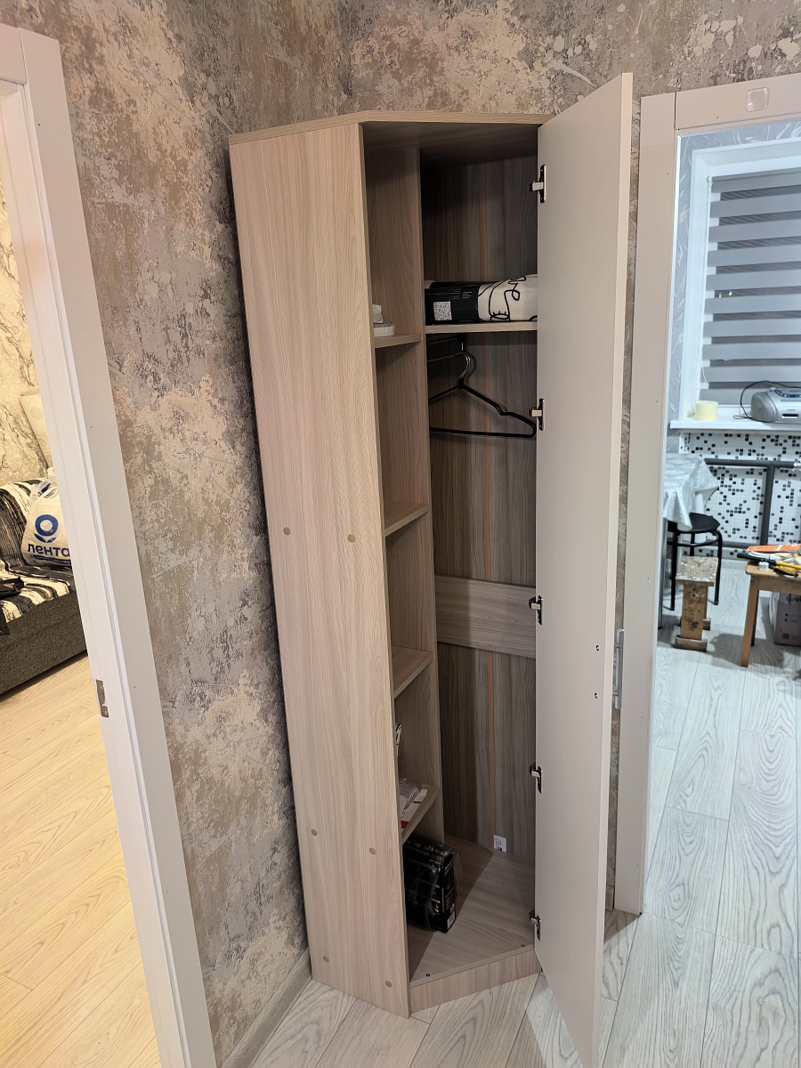Долго искали шкаф подходящего размера, остановились на угловом.  Несмотря на компактные размеры- вместительный, качественные материалы и фурнитура. Удобный в использовании. Экономит пространство- для небольших комнат, можно подогнать под свои размеры. Доставка вовремя. В назначенный день приехали два сборщика с инструментами, собрали быстро . Сборкой осталась довольна, спасибо! Получился отличный шкаф. Покупкой довольны.