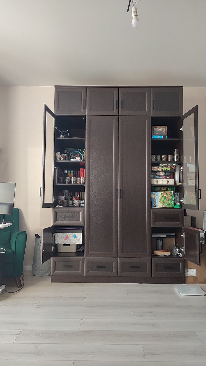 Отличный шкаф. Сделан качественно. Благодаря подобранным размерам получился очень вместительным. Изготовление и доставка заняли всего неделю. Был брак детали одного из ящиков. Лицевая стенка, к которой крепится фасад, имела кромку с нижней, не лицевой стороны (со стороны дня), а верхняя, которую видно при открытии ящика была без кромки. После обращения в поддержку, в течение двух дней привезли новую деталь.